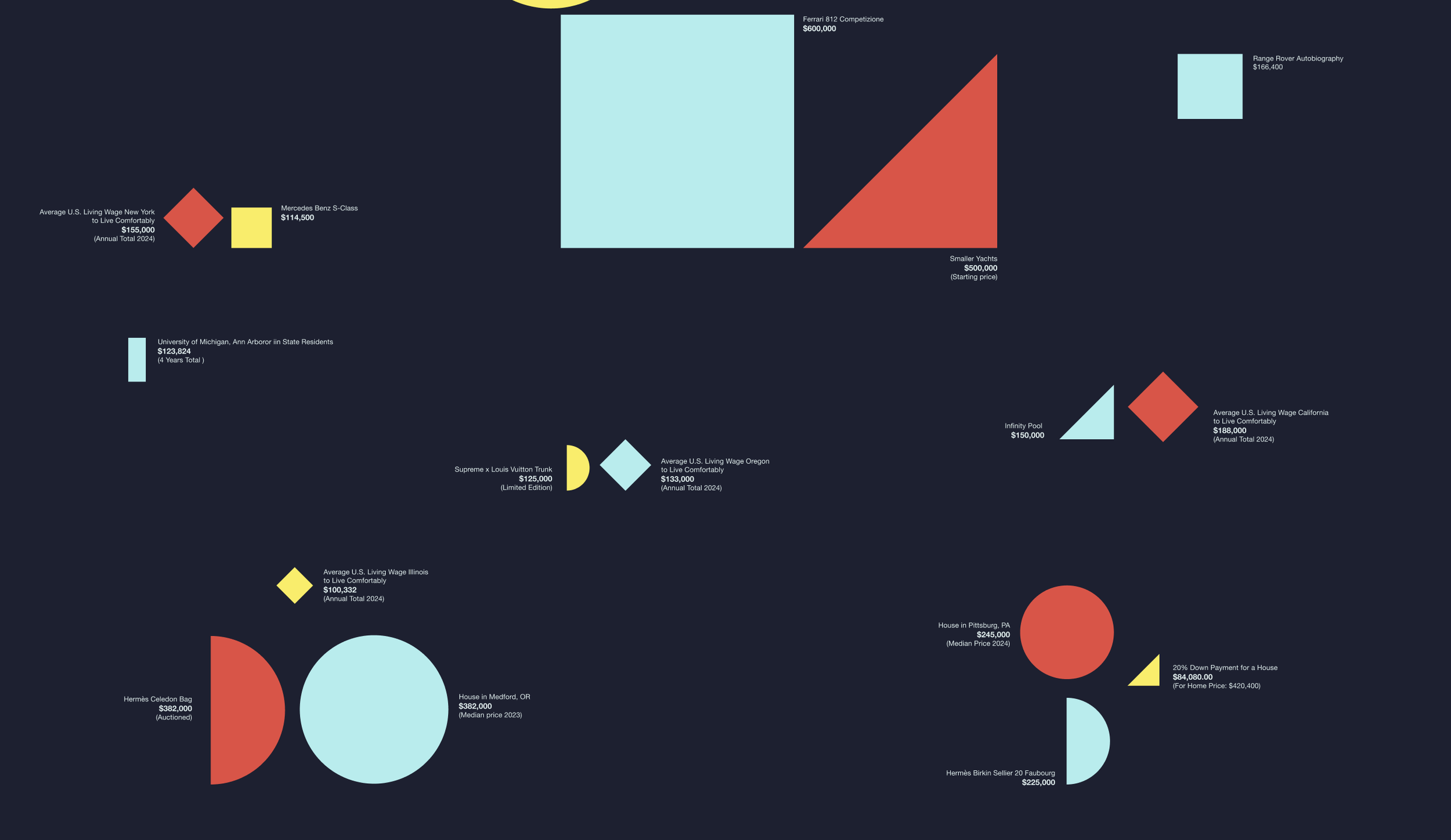 I then collected data from 2023 - 2024 and built a chart. But I needed another visual representation. I was inspired by Mondrian’s blocks of color, clean lines, and use of sizes. From $10,000 to $600,000, I mapped out what money covers for average Americans nationwide, starting with the essentials like: rent, childcare, healthcare, student debt, a down payment for a home. Then contrast that to the cost of a designer bag, a luxury car, and a private jet.