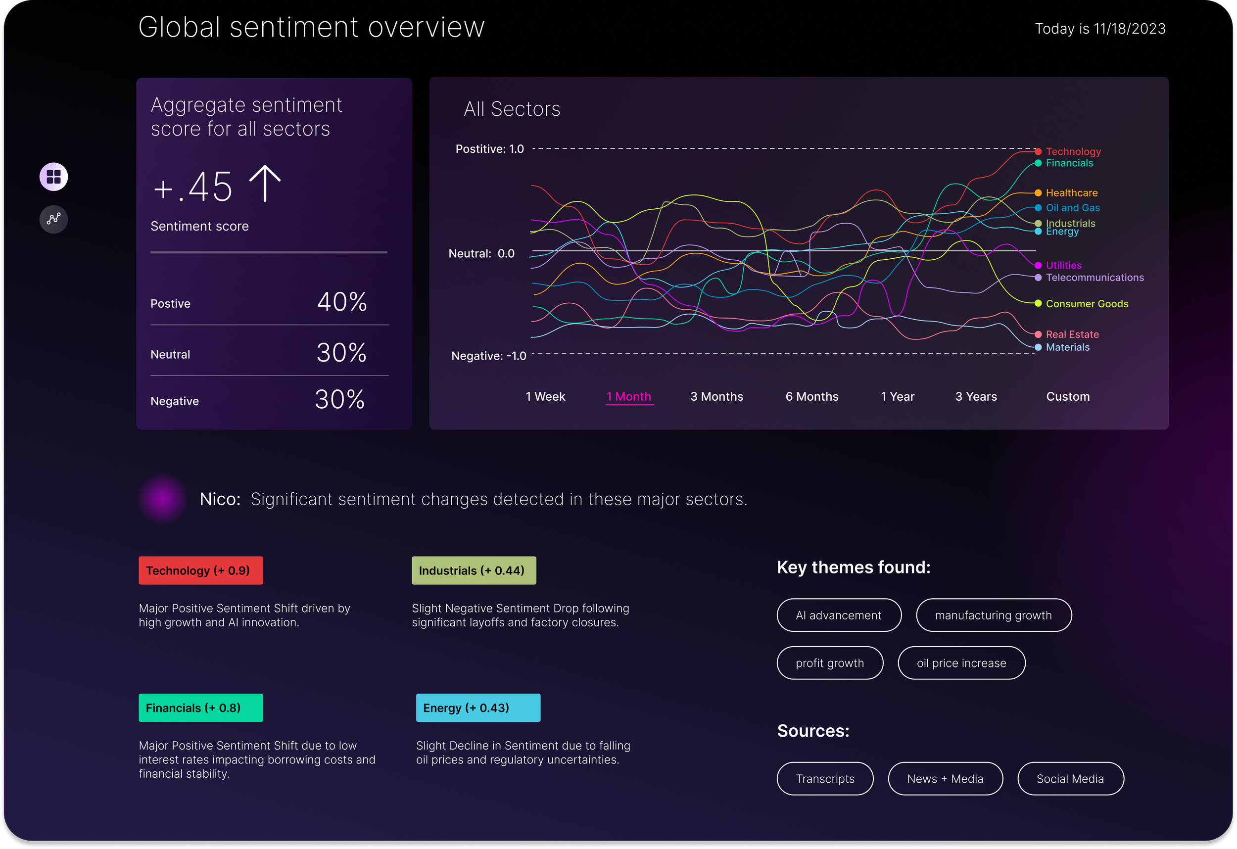 For example, Nico can be a decision-intelligence system for financial analysts in Private Equity. It uses AI-driven sentiment as a predictive signal to support research analysis, helping firms understand what’s driving markets, assess risk earlier, and make better investment decisions under uncertainty or make well-informed predictions.